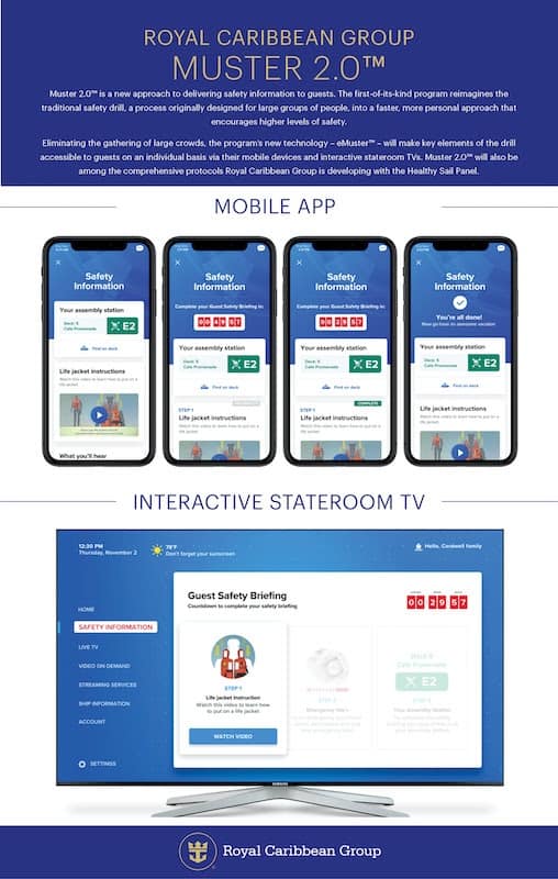 Con Muster 2.0, los elementos clave del simulacro de seguridad, incluida la revisión de qué esperar y a dónde ir en caso de emergencia, y las instrucciones sobre cómo usar correctamente un chaleco salvavidas, serán accesibles para los invitados de forma individual en lugar de un enfoque de grupo que se ha seguido históricamente. Se utilizará la nueva tecnología, eMuster™, para ayudar a proporcionar la información a los huéspedes a través de sus dispositivos móviles y televisores interactivos en los camarotes. Los viajeros podrán revisar la información en su propio tiempo antes de zarpar, eliminando la necesidad de las asambleas tradicionales de grupos grandes. El nuevo enfoque también permite que todos a bordo mantengan un mejor espacio a medida que los pasajeros se mueven por el barco, y les permite disfrutar más de sus vacaciones sin interrupciones.